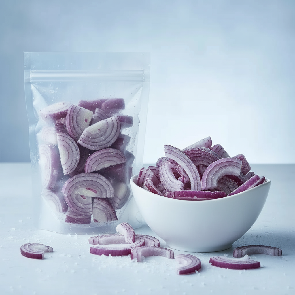 La cebolla morada que vendemos, es tu aliada perfecto en la cocina, eliminando el tedioso proceso de pelar, picar y llorar, sin sacrificar la frescura y la calidad. Cosechadas en su punto óptimo, nuestras cebollas moradas son seleccionadas a mano, cortadas en el tamaño ideal y congeladas rápidamente para preservar su color intenso, su textura crujiente y su sabor característico, ligeramente dulce y menos picante que la cebolla blanca.