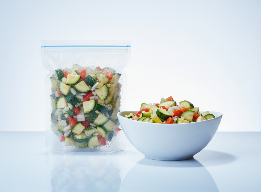 ¡La base perfecta para tus salteados, tortillas y guisos, ya cortada y lista para usar! Nuestro Mix Congelado de Zucchini, Cebolla y Pimiento es la forma más inteligente de tener vegetales frescos y sabrosos siempre a mano. Olvídate de lavar, picar y limpiar; hemos hecho el trabajo por ti, seleccionando los mejores vegetales en su punto óptimo de maduración y congelándolos al instante para preservar toda su textura, sabor y nutrientes.
